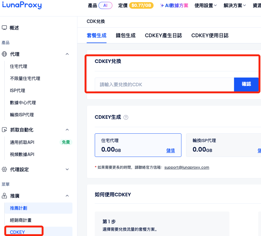 LunaProxy.com 官网3-6 折,CDKEY 激活码兑换,流量有效期 90 天,以下有详细 兑换步骤